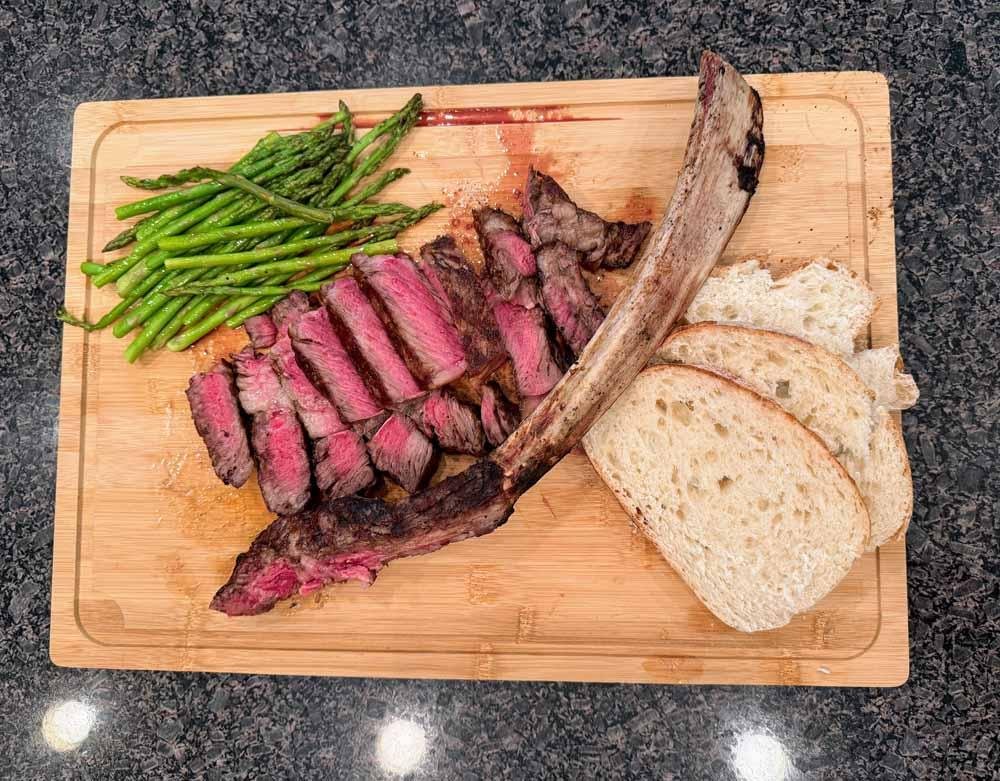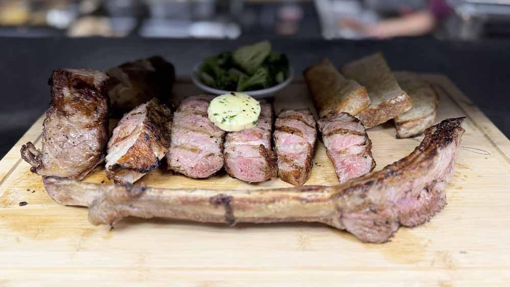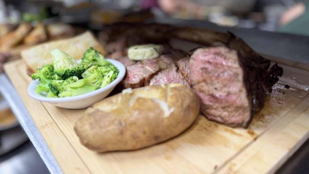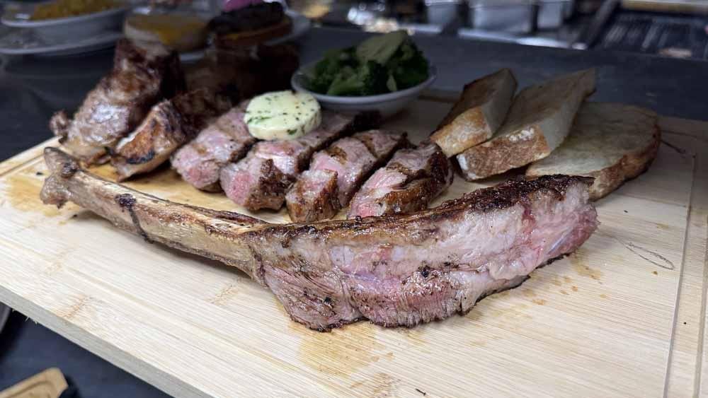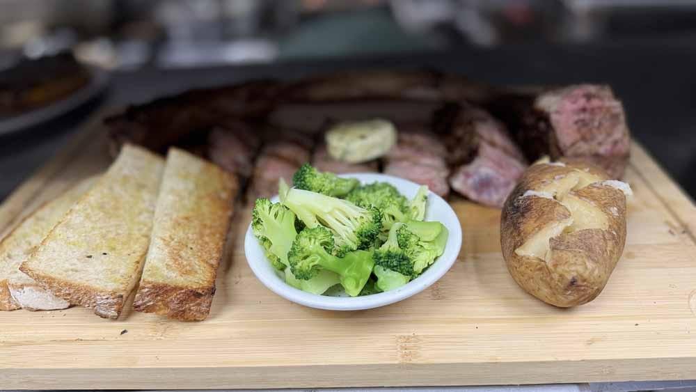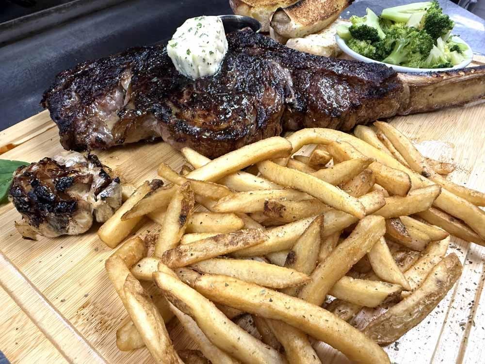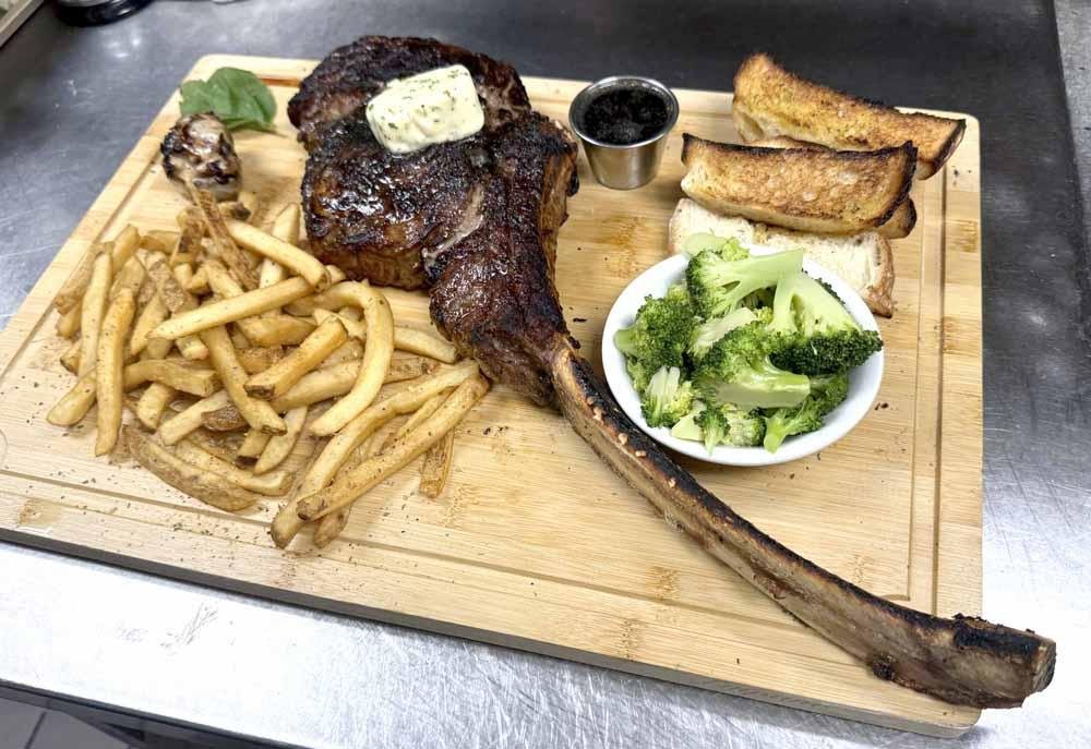 These 3lb tomahawk steaks are $99 all day and include Potato, Vegetable, Soup or Salad and homemade sourdough bread.