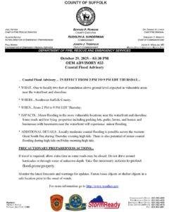 The Suffolk County Department of Fire, Rescue and Emergency Services has issued a Coastal Flood Advisory for Southwest Suffolk County, in effect Thursday 10/30/2025 from 2 PM to 9 PM EDT. This alert comes in response to expected tidal conditions and onshore winds that may cause minor flooding in vulnerable shoreline areas.