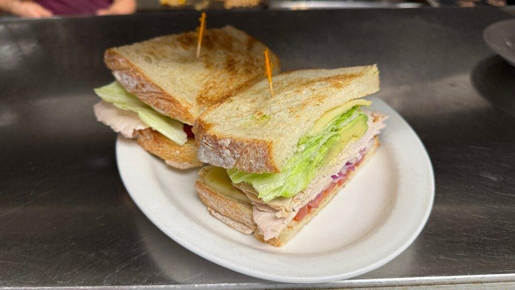 Oven-roasted turkey breast, sliced fresh and layered with creamy avocado, Swiss cheese, crisp iceberg lettuce, ripe tomato, and red onionβall stacked on our famous sourdough bread. Finished with house dressing and served with your