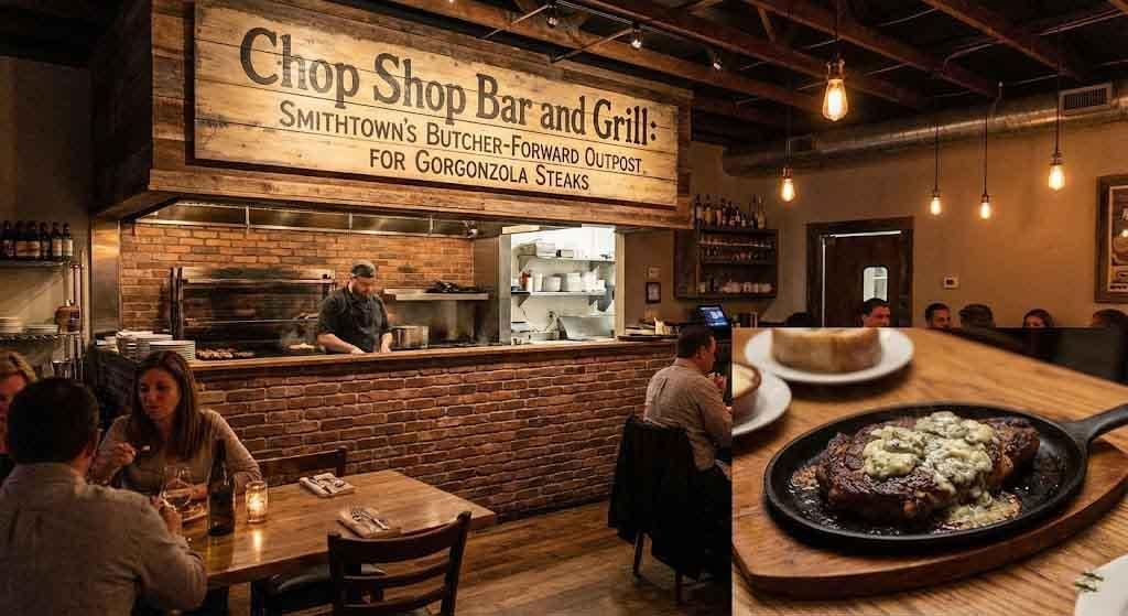 There is a moment, every evening around six o’clock on Smithtown’s East Main Street, when the light does something particular. It catches the brick facade of a building at number 47, throws long amber shadows across hardwood floors visible through plate glass, and illuminates the kind of scene that Richard “Bull” Smith himself might have recognized as the essential purpose of a town center — a place where people gather, not out of obligation, but out of appetite. Chop Shop Bar & Grill occupies that light. It occupies that corner of Smithtown’s civic life with the quiet authority of a restaurant that has figured out what it is and refuses to apologize for it: a butcher-forward, neighborhood steakhouse that treats a Tuesday prix fixe dinner with the same seriousness that the old chop houses of Manhattan once reserved for power lunches.