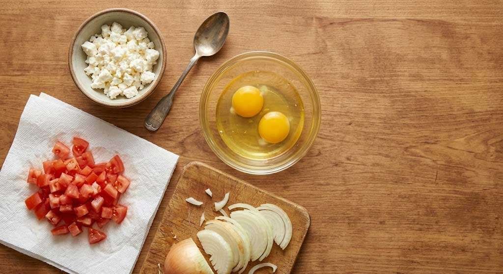Start by getting your mise en place in order. Dice the tomatoes into small, uniform pieces — about a quarter inch — and set them on a paper towel to absorb any excess moisture. Crumble or break the feta into small chunks rather than fine crumbles; you want pockets of cheese, not a uniform layer. Slice the onion thin.