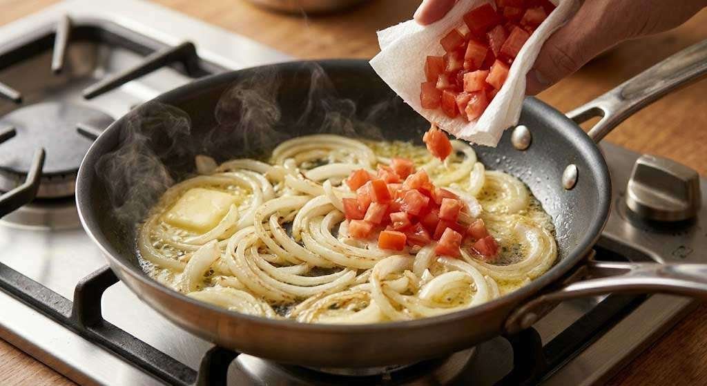 Heat a 10-inch nonstick pan over medium-low heat and add one teaspoon of butter. Once it melts and begins to foam, add the sliced onion with a small pinch of salt. Cook, stirring occasionally, for 3 to 4 minutes until the onion softens and turns translucent. Add the diced tomatoes and cook for another minute, just long enough to warm them through without releasing too much liquid. Remove the filling from the pan and set it aside. Wipe the pan lightly if needed.