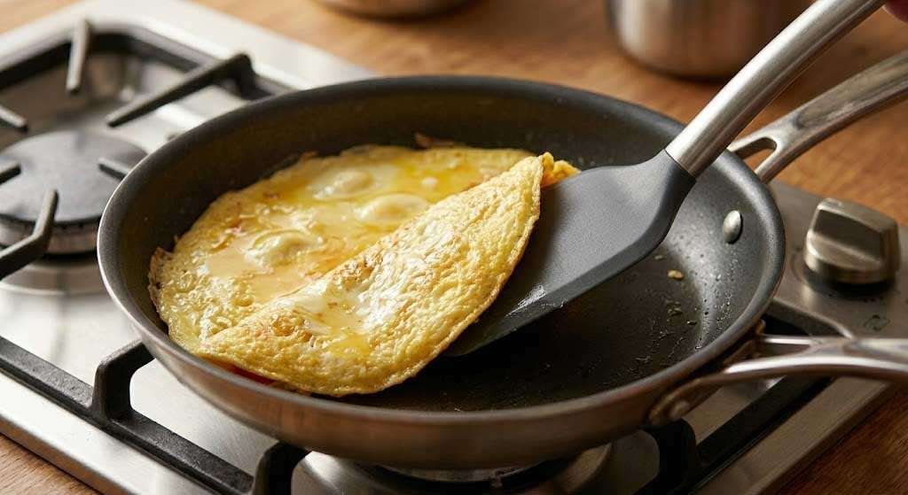 The wet top is not a mistake. Many home cooks overcook omelets waiting for the surface to look fully dry. A slightly wet, glossy top when you add the filling means the interior will finish cooking from carryover heat — and the result is creamy, not rubbery.