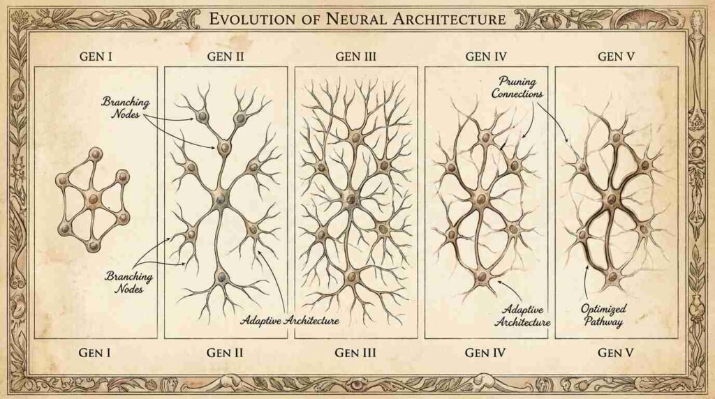 The formal genealogy of machine learning’s evolutionary turn begins, for practical purposes, with Kenneth Stanley and Risto Miikkulainen’s 2002 paper in Evolutionary Computation: “Evolving Neural Networks through Augmenting Topologies.” The algorithm they described — NEAT, for Neuroevolution of Augmenting Topologies — addressed a problem that had defeated earlier attempts at evolving neural networks: how to meaningfully compare and recombine networks of different structures. Prior approaches had attempted evolution on fixed topologies, varying only weights. Stanley and Miikkulainen’s insight was that structure itself should be subject to selection — that networks should be permitted to grow more complex over generations, with historical markers called innovation numbers allowing the algorithm to track which structural elements shared common ancestry.