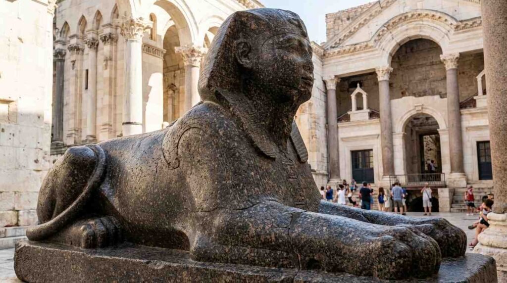 The light in November comes late and horizontal. At seven in the morning the Peristyle is empty stone. Pigeons. The sphinxes — Egyptian granite, brought from Aswan specifically for the palace, two of the original four still largely intact — sit in their niches with an expression of institutional patience. They have been sitting there longer than the Roman Empire lasted. They have been sitting there longer than Christianity as an institutional structure has existed.