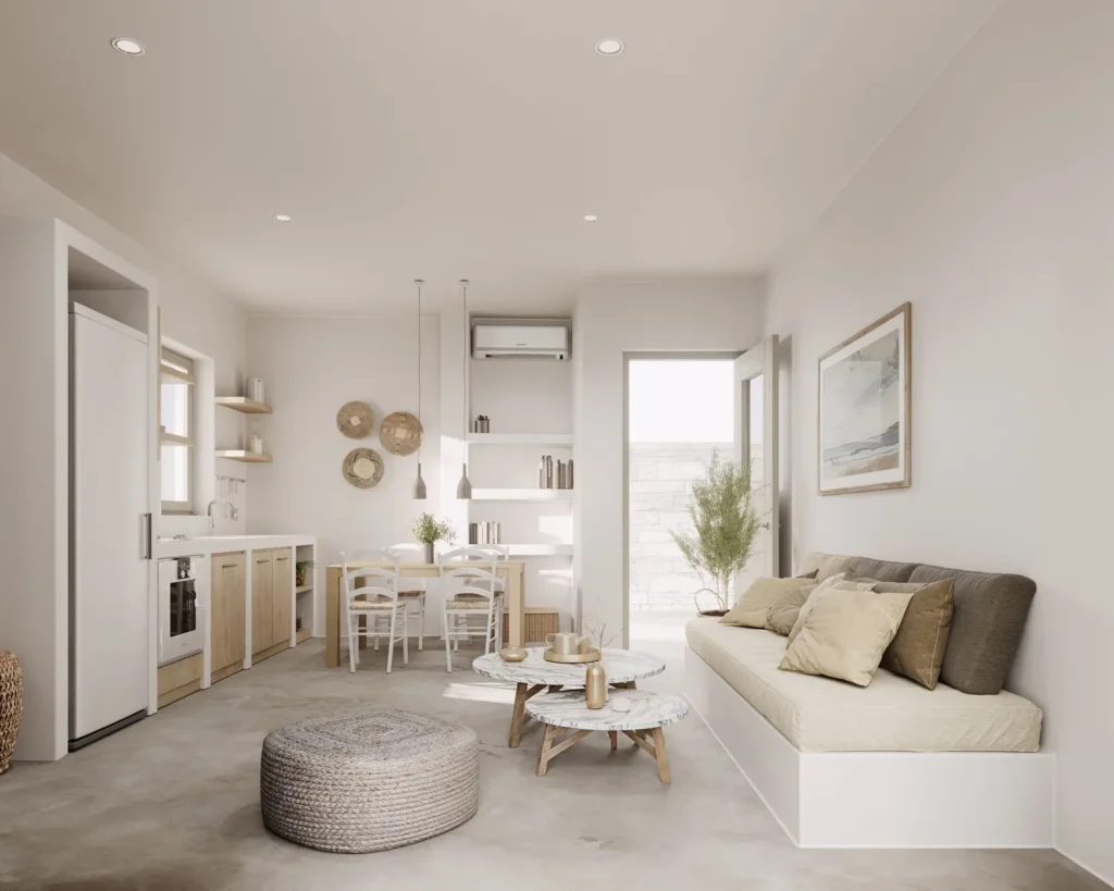 This 150m² (1,615 sq ft) villa is currently under construction and scheduled for delivery in June 2026. It’s designed with a contemporary Cycladic aesthetic—bright interiors, open spaces, and large windows that frame the Aegean Sea and the island of Antiparos.