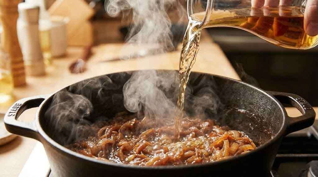 Once the onions are properly built, the broth phase is where depth compounds. A deglaze with dry sherry or cognac — never skip this — lifts the caramelized fond from the bottom of the pot and integrates weeks of flavor in a matter of seconds. Add dry white wine next, let the alcohol cook off, then build with a high-quality beef broth.