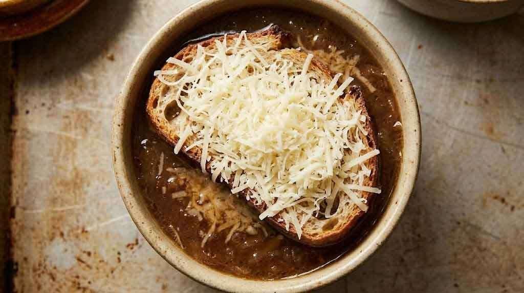 Gruyère is the correct cheese for this soup — not Swiss, not mozzarella, not a blend-bag from the dairy aisle. Gruyère melts into a cohesive, deeply savory crust that blisters under the broiler and pulls at the edges of the crock in exactly the way French onion soup is supposed to. A small amount of freshly grated Parmesan over the top adds a sharp, salty edge that sharpens the whole composition.