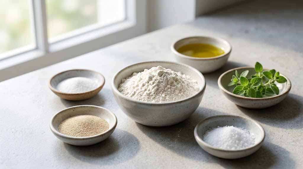 The foundation of any exceptional dish is its ingredients. For this premium pita, we select components that emphasize simplicity and purity. This visual index highlights the distinct textures we are working with: unbleached bread flour (for a strong, chewy structure), active dry yeast, flaky sea salt, a pour of premium golden extra virgin olive oil, and a sprig of fresh, aromatic oregano.