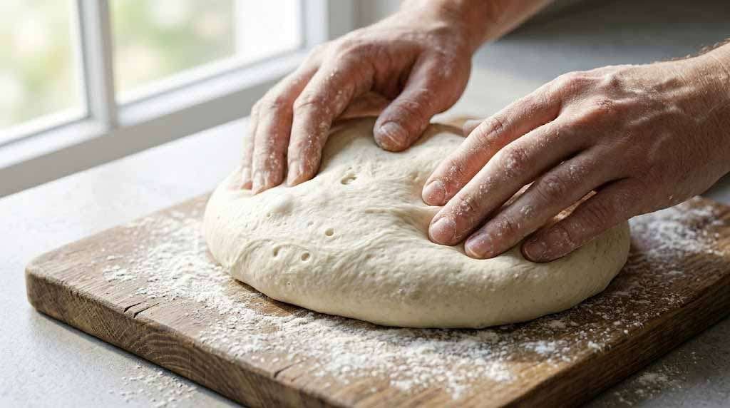 - Active Knead: Turn the shaggy dough out onto a well-floured wooden surface (from our example). Knead for 8-10 minutes. The focused hands illustrated here show the active folding, stretching, and interaction that develops the precise gluten structure. (Check for that specific matte finish).