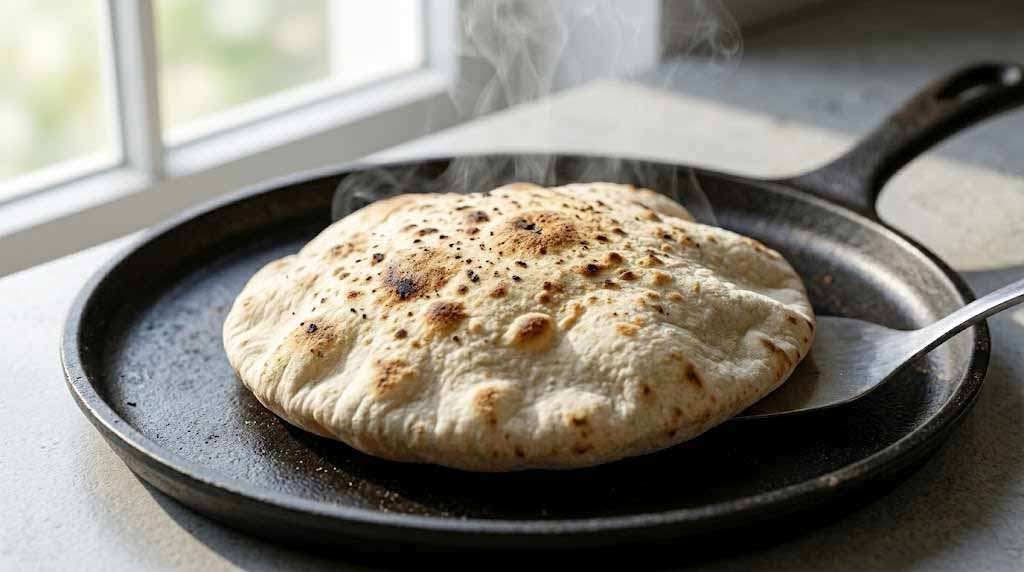 - Baking (The Puff): Preheat your oven and baking stone completely at 500°F (260°C). Slide 2-3 discs directly onto the hot baking stone. (Check for that specific matte finish). Bake for exactly 3-4 minutes. Watch the single, perfectly formed, fully puffed pita bread (above)—its explosive leavening illustrated here on the baking stone is the core process of the perfect pocketless pita, with defined char spots and realistic steam.