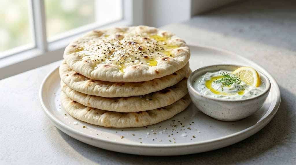 With the last pita removed from the griddle, our visual journey is complete. Here, we synthesize the textures of previous stages. The pitas, warm from the explosive cook, are stacked high on a modern off-white ceramic plate. We brush them with golden olive oil (from our initial index) and sprinkle with the coarse flaky sea salt and the vibrant dried Greek oregano.