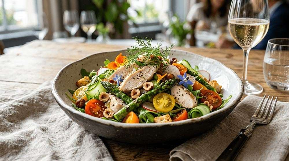 A bright and creamy classic featuring tender roasted chicken, crunchy celery, and toasted pecans, finished with a zesty lemon-dill dressing.