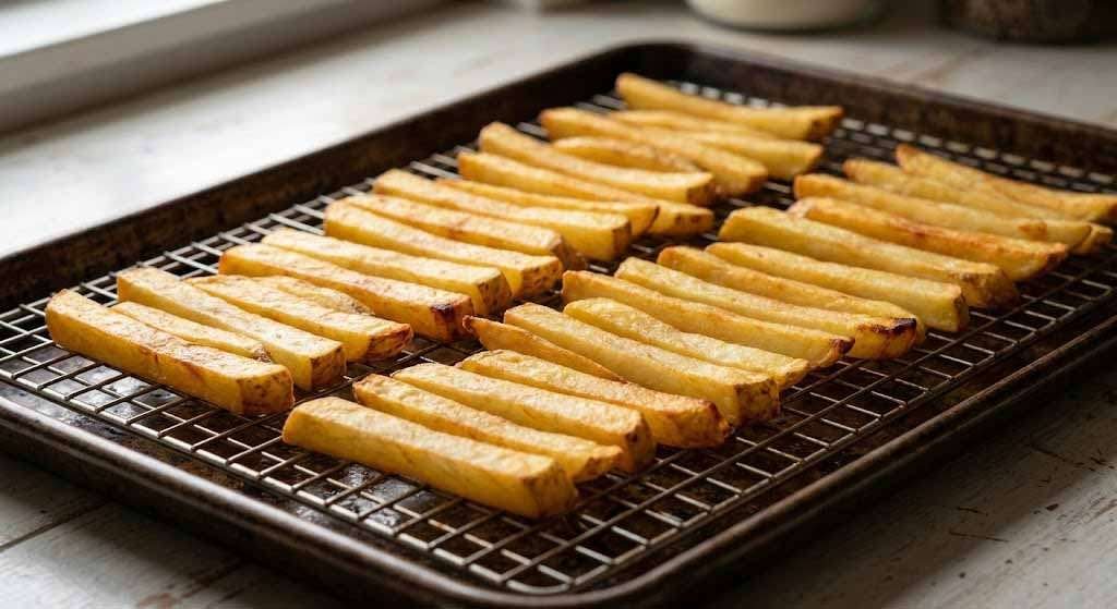 [PHOTO 1: Thick-cut golden fries spread on a wire rack over a sheet pan, just out of the oven — crispy and deeply golden, some showing slight char at the edges]