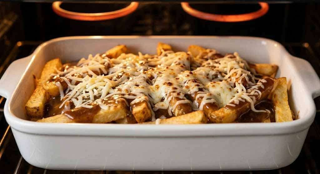Transfer the hot fries directly from the oven or fryer onto an oven-safe plate or small cast iron pan. Work quickly — the assembly needs to happen while everything is hot. Layer the fries, ladle the gravy generously over the top (don’t be timid — this is Disco Fries, not a spa dish), then pile on the shredded mozzarella.