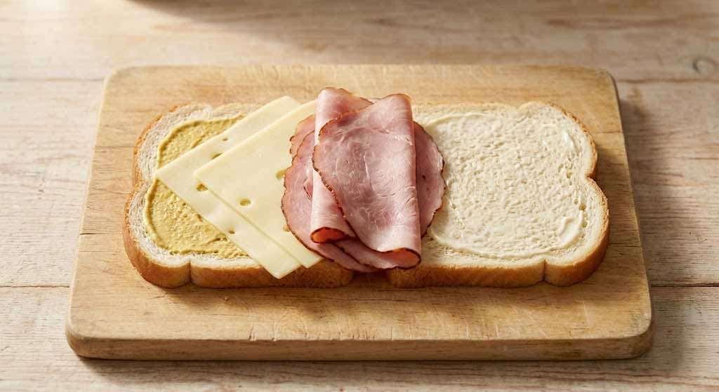 - On each mustard side, place 1 slice of Swiss cheese, then half the ham, then a second slice of Swiss cheese. Top with the mayo-side slice, mayo-side down. Press firmly to compact.