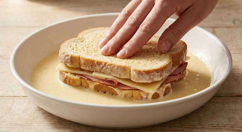 Start by building the sandwich before the batter ever touches it. Lay out two slices of bread for each sandwich and add a layer of Dijon mustard to one side and a thin swipe of mayonnaise to the other — this is the flavor base that most recipes skip, and it makes a noticeable difference. Layer the Swiss cheese on the mustard side first, then the ham, then another slice of Swiss on top. The cheese-on-both-sides approach sandwiches the ham and ensures even melt from the inside out. Press the second slice of bread on top and give the whole thing a firm press with your palm to compact it slightly.