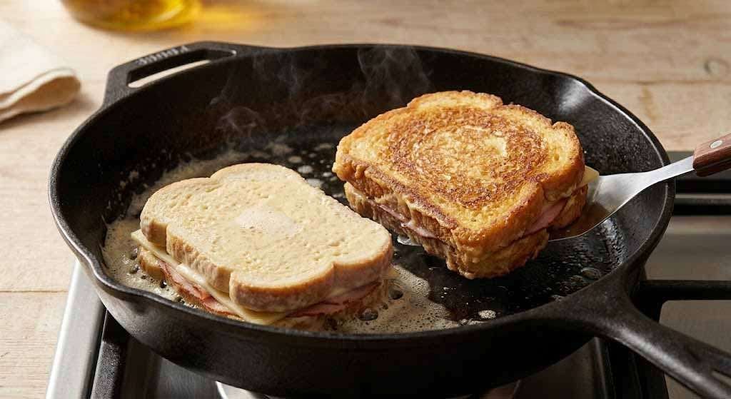 - Carefully place the battered sandwiches in the skillet. Cook undisturbed for 3–4 minutes until the underside is deep golden and lifts cleanly from the pan.