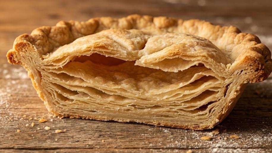 The lamination argument is the one that matters most to the visual. Pull apart a proper lard crust — one made with cold, fresh leaf lard, correctly cut into flour, not overworked, properly rested — and you will find distinct, paper-thin layers. The interior is not homogeneous. There is a structure to it, the way there is structure to puff pastry or croissant dough, just less pronounced. Pull apart a well-made shortening crust and you find a uniform crumb, tender throughout, with no distinct layering. Both are called flaky in common usage. They are not the same phenomenon.