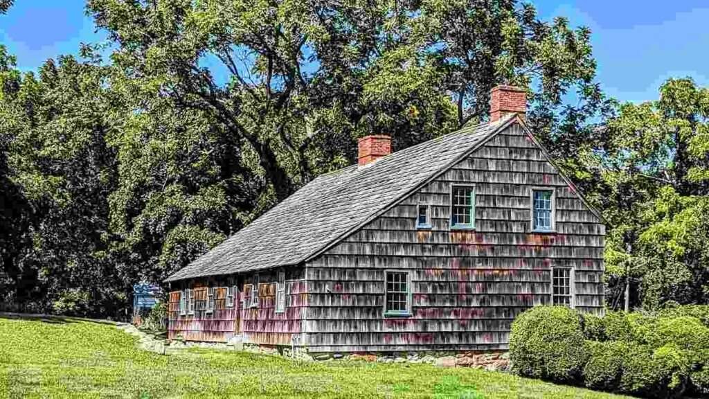 You can see it from the street. Cedar shingles weathered silver. Two brick chimneys. A saltbox roofline that started as a single room in 1665 and grew over the centuries the way old things grow — slowly, under pressure, adding what the moment required.