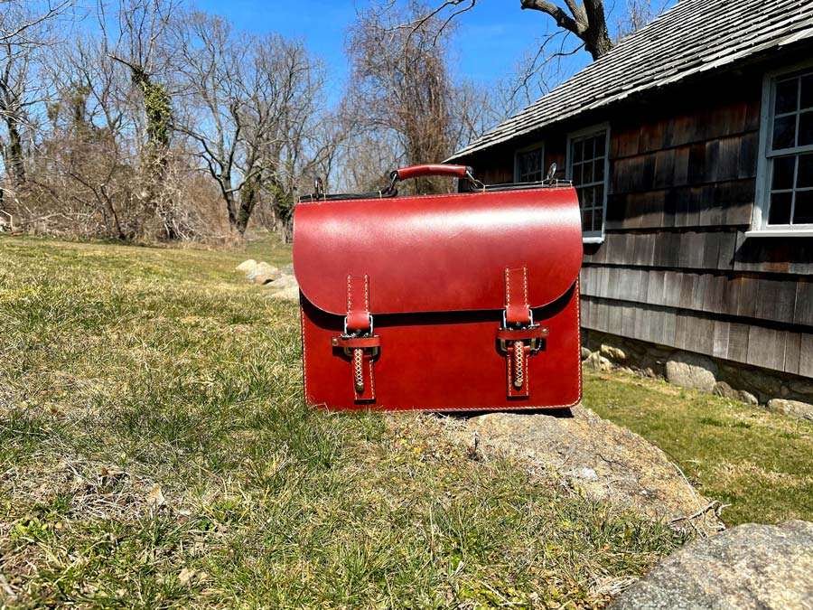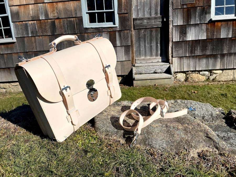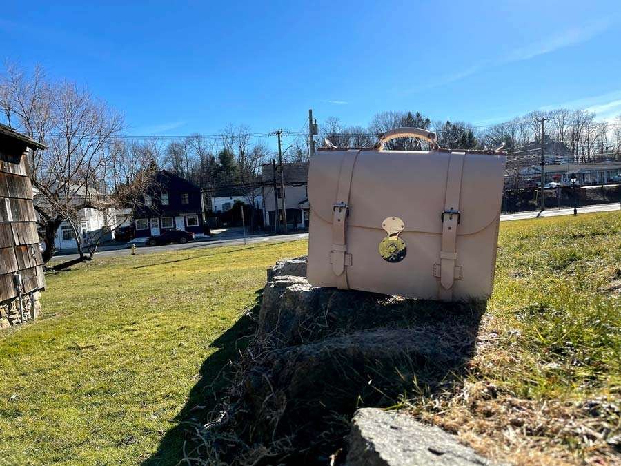The burgundy briefcase — that’s the signature Marcellino style, the deep antique bridle leather with the double-latch hardware I developed, the specific curve of the flap that makes it recognizable at a distance. I photographed it with the Brewster House visible behind it, in the summer when the cedar shingles catch the light and the trees are heavy. The natural-tanned vachetta briefcase — pale bone before the patina starts, straps coiled on the stone — I shot it in early spring with bare trees and the Setauket street visible behind it. The building is the same in both. Different seasons, same ground.