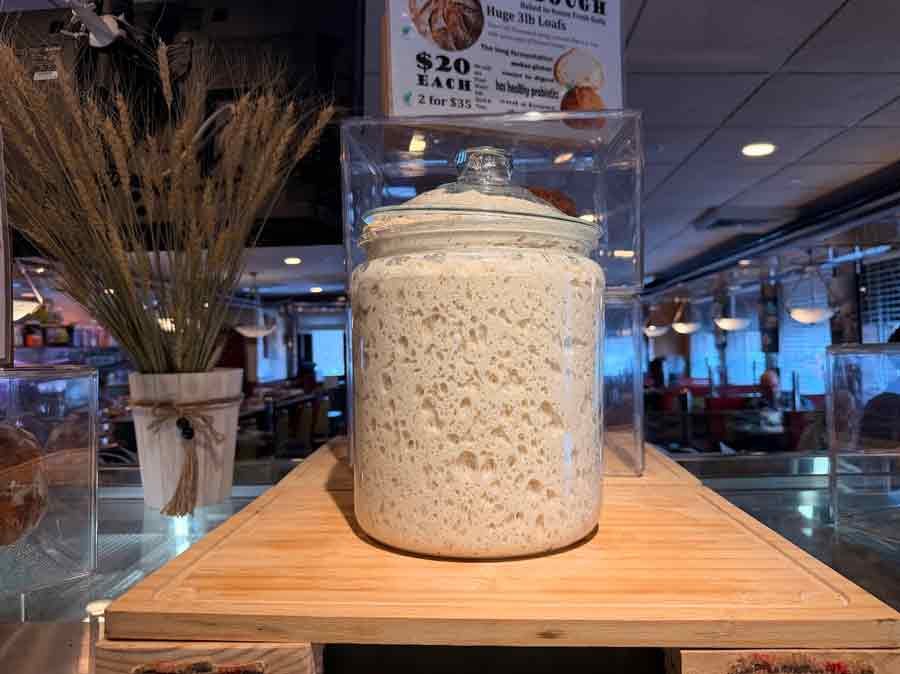 Walk through our front door at 275 Route 25A in Mount Sinai, and before you reach your booth, before the coffee lands on your table, before you even open the menu — you’ll see her. Sitting on a wooden board beside the cake case, tucked into a glass jar with a crystal knob lid, bubbling quietly and confidently: The Mother.