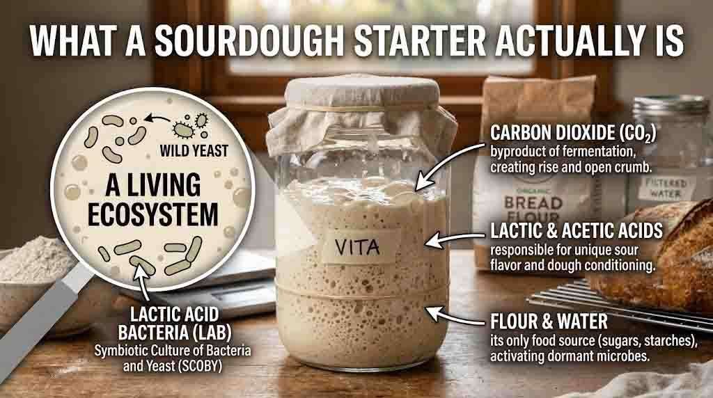 At the most fundamental level, a sourdough starter is a fermented mixture of flour and water — but that description undersells it the way calling a symphony “organized sound” undersells Beethoven. Inside that glass jar lives a complex, self-sustaining community of wild yeast and lactic acid bacteria (LAB), the two workhorses of natural fermentation. The wild yeast produces carbon dioxide — the gas that lifts the dough and creates that signature open crumb. The lactic acid bacteria produce lactic and acetic acids — the compounds responsible for the tangy depth of flavor that distinguishes real sourdough from the commercial imitation.