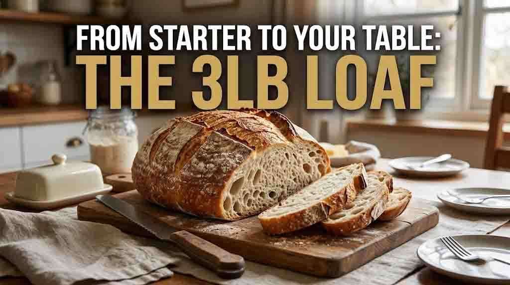 A 3lb loaf is also, we would argue, the correct quantity of real bread for a household. It is substantial enough to last a few days (the acidity from fermentation naturally extends shelf life without preservatives), and satisfying enough that you won’t need to eat as much of it to feel full.