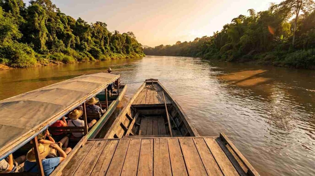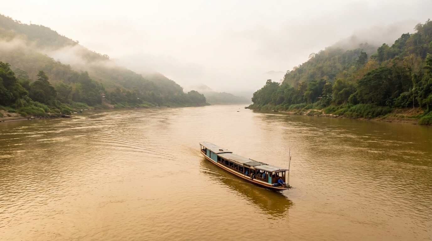 The boat departs Huay Xai, the border town on the Mekong where Thailand ends and Laos begins, early in the morning. It is a wooden vessel roughly twenty meters long, low to the water, bench seating cushioned with thin foam pads worn flat by years of use. The boatman and his assistant do not introduce themselves. They start the engine. The Mekong, which has been moving at its own pace since long before anyone thought to travel it commercially, continues doing so.