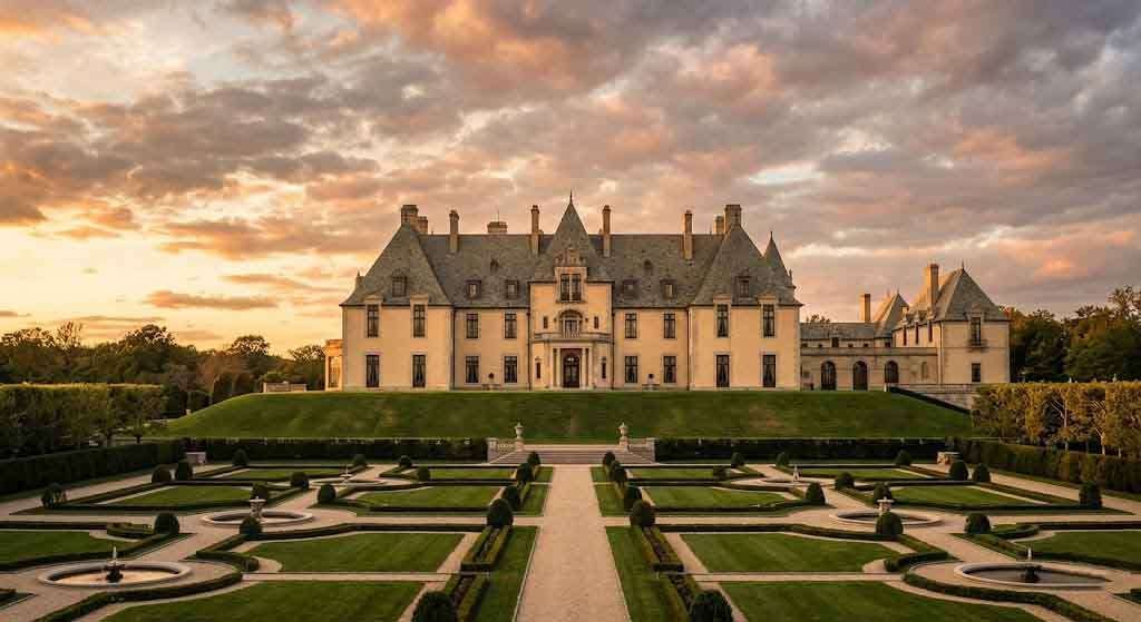 Oheka Castle still stands at 135 West Gate Drive in Huntington, and you can stay there now — 32 guest rooms, weddings booked years out. The Vanderbilt estate at Centerport is a museum. Harbor Hill is gone. Falaise is a Nassau County property open for tours. The Olmsted gardens, or what remains of them, have been carefully restored.
