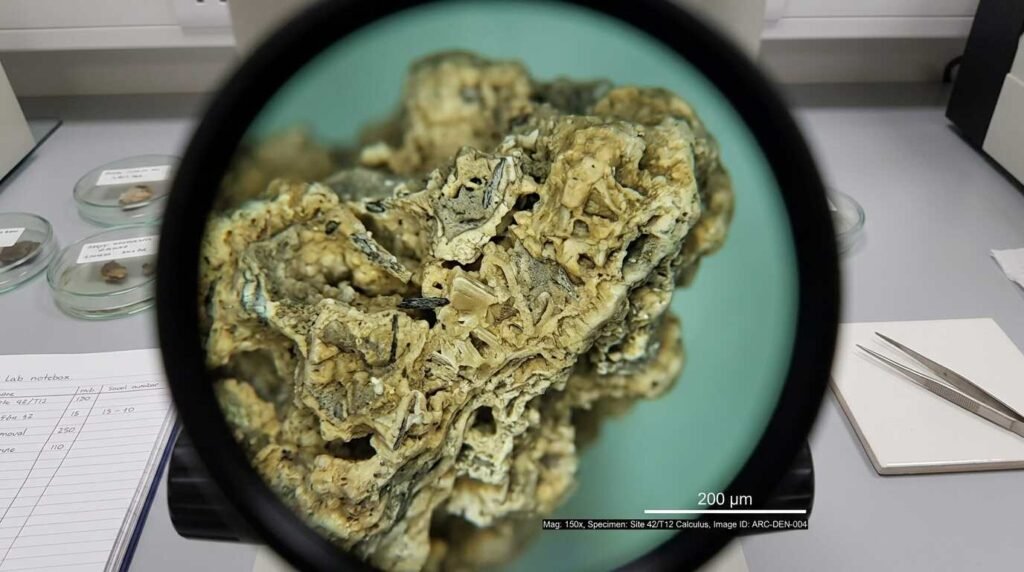 Dental calculus — mineralized plaque, essentially a biological time capsule that accumulates on tooth surfaces during life — has emerged as one of paleontology’s most productive analytical targets. Unlike soft tissue, it preserves organic compounds across hundreds of thousands of years. And unlike bone, it contains material that was in direct contact with what the individual was eating, breathing, and occasionally consuming medicinally.