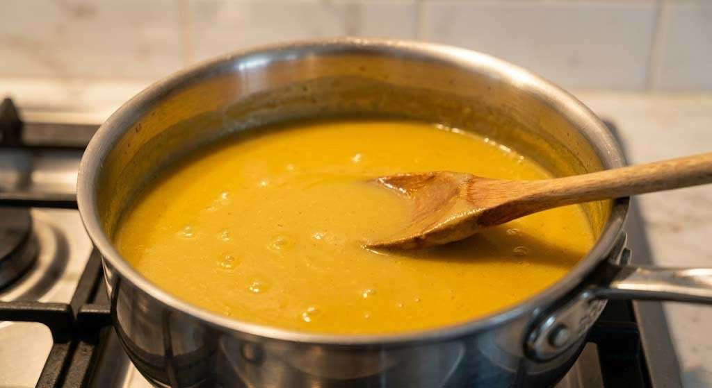 Once the turkey is rested and ready, build the gravy. In a medium saucepan over medium heat, melt two tablespoons of butter. Add two tablespoons of all-purpose flour and whisk continuously for about two minutes, until the roux turns a pale golden color and smells slightly nutty — this is the moment the raw flour cooks out. Slowly pour in the warm chicken stock (and any reserved turkey drippings) while whisking constantly to prevent lumps. Add the turmeric now — a quarter teaspoon is enough to achieve that warm golden color without any detectable flavor from the spice. Season with salt, pepper, and a small amount of onion powder. Let the gravy simmer on low for 8 to 10 minutes, stirring occasionally, until it reaches a smooth, pourable consistency that coats a spoon. Taste and adjust salt.