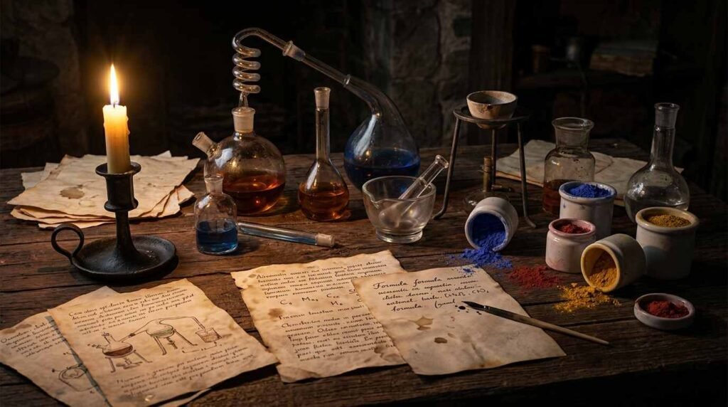 In 1704, a Berlin colormaker named Johann Jacob Diesbach was trying to make a red lake pigment from cochineal when a contaminated potash batch turned his mixture an intense, impossible blue. He had created Prussian blue — the first synthetic pigment in history — without intending to, without understanding the chemistry, and without any concept that corresponded to what he had made. The Platonic Form of blue had just been embarrassed.