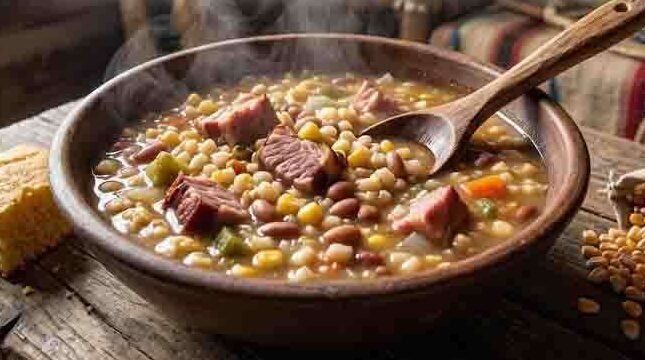 Start the corn in cold water and bring it up slowly. Let it cook for two to three hours before you introduce the meat. This is not a dish that rewards shortcuts. The corn needs time to open fully, to release its starch and become something unified with the broth. Add smoked pork — shoulder or shank, bone-in if you can find it — and let everything marry over low heat for another hour. Season with salt, a little rendered fat, and wild herbs if you have them. The dish is done when it moves like a slow tide in the pot: thick, unified, alive.