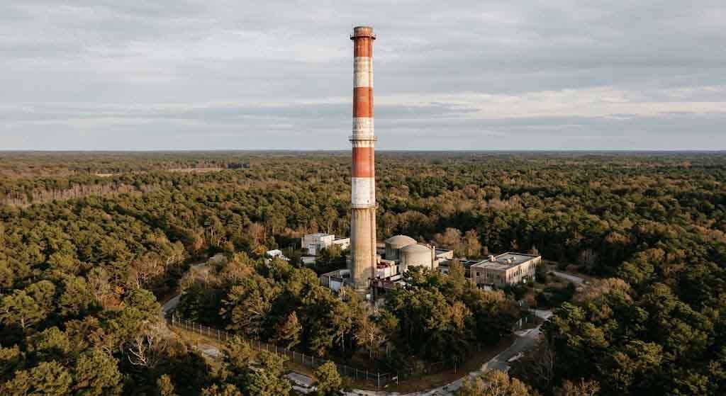 The 100-meter exhaust stack is a visible landmark on the BNL site. The site itself remains an active federal research laboratory, currently operating the Relativistic Heavy Ion Collider and the National Synchrotron Light Source II. Seven Nobel Prizes have been awarded for work conducted at Brookhaven Lab.