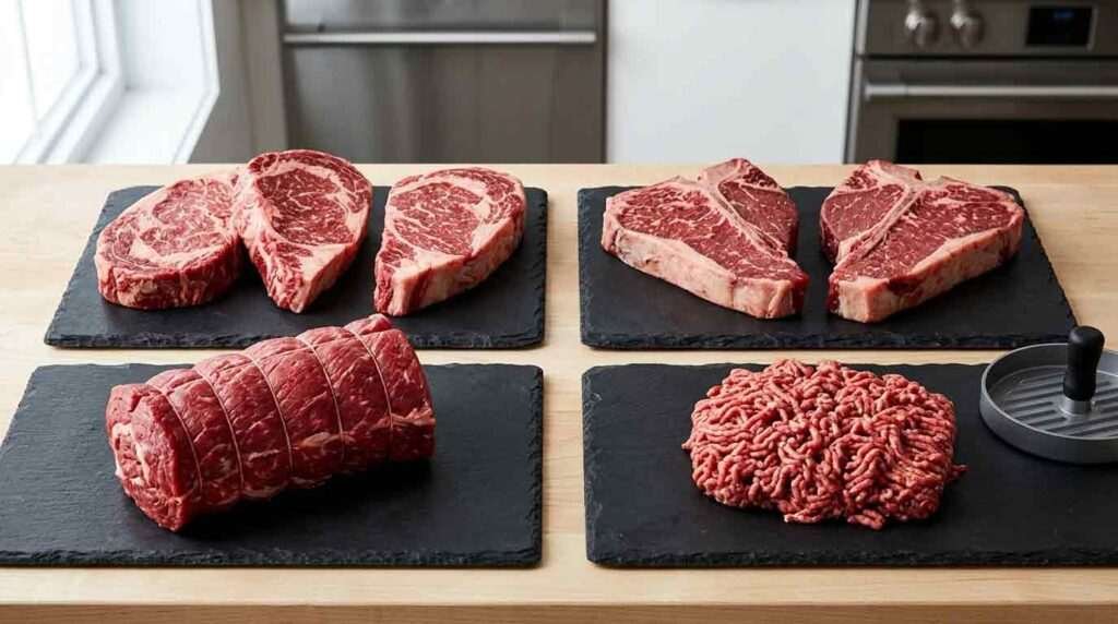 Armed with the geography of the steer, navigating a butcher case becomes intuitive. When you pick up a package labeled “chuck eye steak,” you know you’re getting a shoulder-adjacent cut with good marbling and enough flavor to grill or pan-sear — as long as you don’t expect filet mignon tenderness. When you choose a bone-in short rib, you’re committing to time: three to four hours of braising minimum to convert that connective tissue into something genuinely extraordinary. A sirloin steak tells you that you can grill it hot and fast, rest it, and eat well without ceremony. A round roast tells you to slice it thin and cold, or slow-roast it to medium-rare and serve it European-style with a sharp mustard.