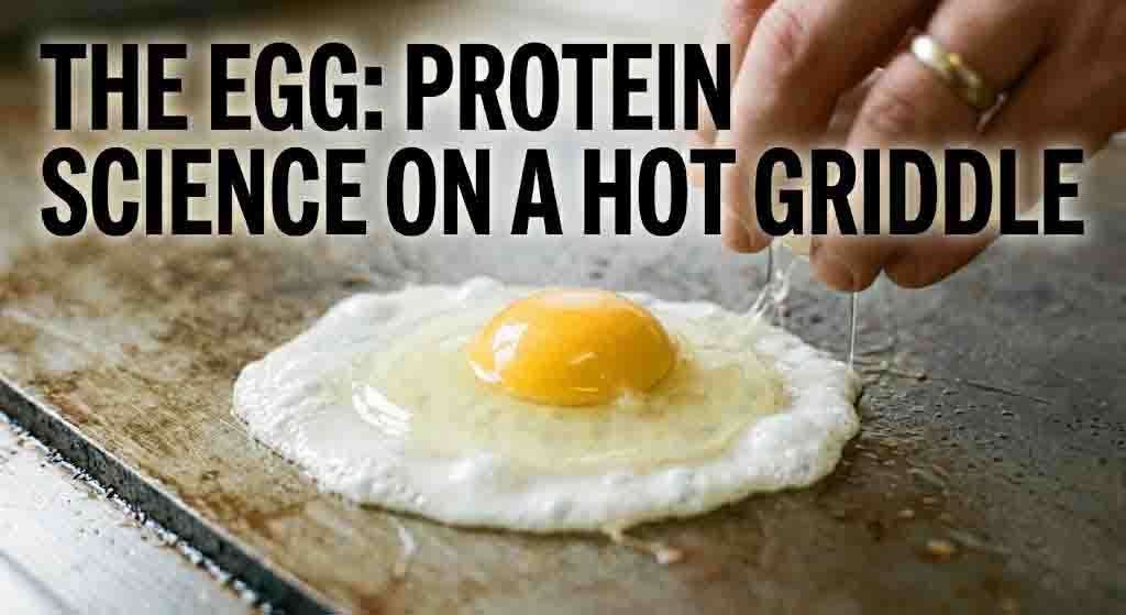 When an egg hits a 375°F griddle surface, the proteins in both the white and the yolk immediately begin to denature — their long-chain structures unfurl and cross-link with neighboring proteins, turning what was liquid to solid. The browning on the underside of a deli-style fried egg is actually the Maillard reaction occurring between proteins and the small amount of reducing sugars present in the egg — eggs contain about 1% carbohydrate, much of which is glucose.