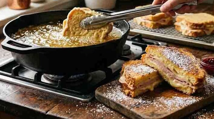 The Monte Cristo rewards patience at every stage. Build the sandwich, compress it, chill it briefly. Mix your batter — pancake mix thinned slightly with milk or sparkling water, seasoned with salt. Heat your oil to 350°F, using a thermometer. Dip the sandwich, let the excess batter drip off, and lower it gently into the oil. Fry until deeply golden, two to three minutes per side if deep-frying, slightly longer if pan-frying in butter.