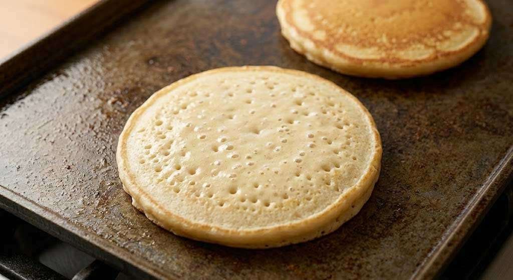 - Cook pancakes: pour ½ cup batter per pancake onto a lightly buttered 350°F griddle. Cook until bubbles cover the surface and edges look dry, about 2½–3 minutes. Flip once and cook 1–2 minutes more. Transfer to the warm oven.