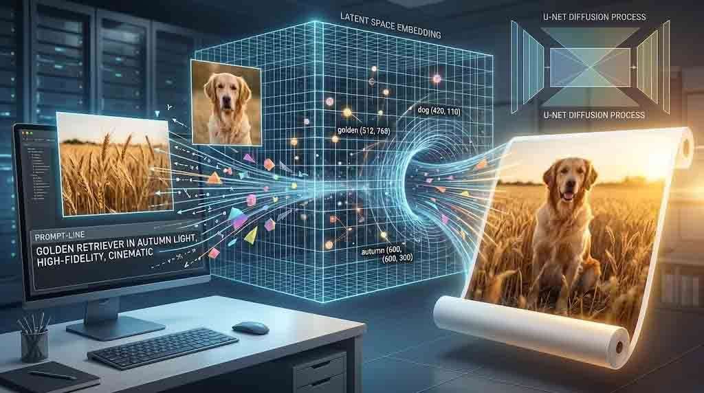 Somewhere inside a neural network, the word “golden” and a photograph of afternoon light on wheat share the same address. Not metaphorically — mathematically. They occupy nearby coordinates in a high-dimensional map that no human designed and no human fully understands, yet one that modern AI systems navigate with startling precision every time you type a prompt and watch an image materialize from noise. This is the latent space, and it is the organizing intelligence behind every text-to-image system that has reshaped creative production over the last three years.