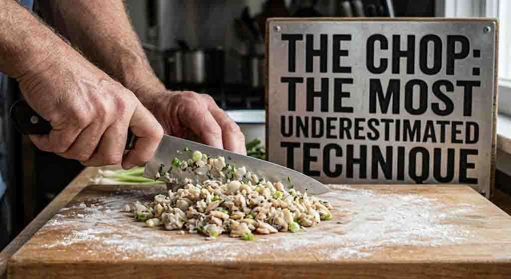Start by removing any tough, dark-edged outer portions of the larger quahog meat if you’re using chowder clams — these can be chewy in an unpleasant way if left in large pieces. The white, plump interior meat is what you’re after. Lay it flat and use a rocking motion with your knife, working it into a rough, uneven mince. Deliberately leave some variation in the size of the pieces. The lack of uniformity is a virtue here, not a failure of technique.