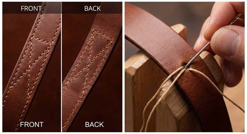 Some manufacturers have marketed “saddle stitch” machines that approximate the visual appearance—principally the angled stitch line—using modified lock-stitch or chain-stitch mechanisms. These are marketing fabrications. The Craft Industry Alliance reported in 2022 that the proliferation of “hand-stitched look” machines in Chinese and Southeast Asian factories has created a global market flooded with goods that mimic the aesthetic of handwork while delivering none of its structural advantages. The tell is always the reverse side: a true saddle stitch produces a near-identical pattern on both faces of the leather, front and back. A machine stitch, no matter how cleverly engineered, will always show a distinct difference between the needle side and the bobbin side (Fine Leatherworking, “Saddle Stitching Video Round Up,” 2024).