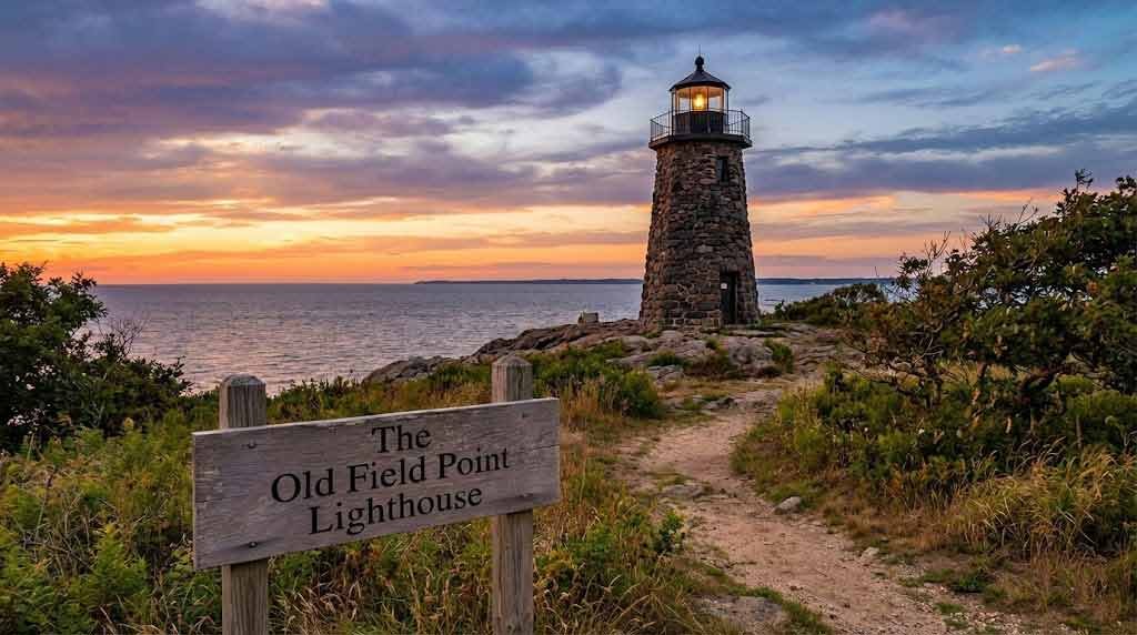 Two feet of granite ashlar. That is what separates a Victorian-Gothic tower from two centuries of Long Island Sound fury — nor’easters that turned the water white, coastal squalls that swallowed schooners whole, and the relentless negotiation between a hostile sea and the commerce of a young nation. The Old Field Point Lighthouse, standing at the northern tip of the village bearing its name between the entrances to Port Jefferson Harbor and Stony Brook Harbor, is not a romantic postcard. It is a survivor. And on this North Shore, where the bluffs have been watching maritime history unfold since the first colonists carved roads through dense timber and salt marsh, survivors carry weight.
