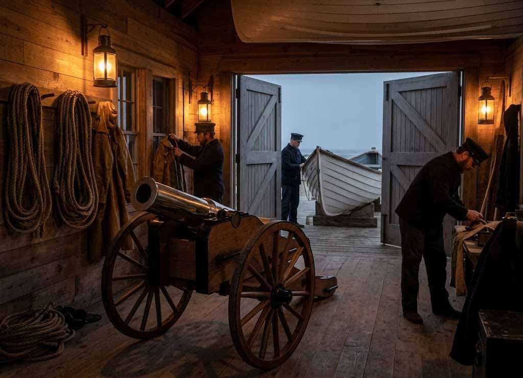 When a wreck was sighted, the response was drilled to the point of reflex. The Lyle gun — a small bronze cannon that fired a weighted projectile trailing a thin line — was the first tool. If conditions allowed, surfmen tried to establish a line to the wreck, rig a breeches buoy (essentially a life ring fitted with canvas shorts), and haul survivors to shore one at a time. If the surf was too heavy for a line approach, they launched a surfboat into waves that would send most recreational boaters running for the dock.