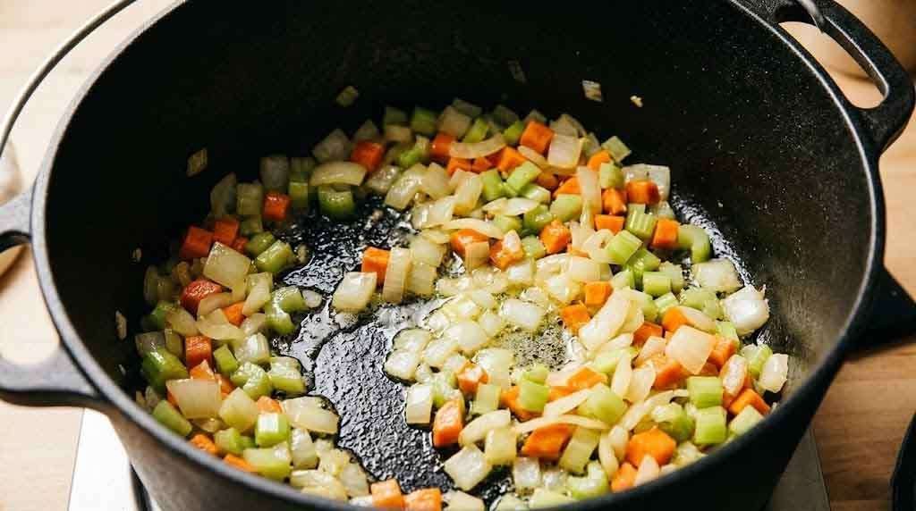 In a large Dutch oven or heavy stockpot, melt the butter over medium heat. Add the onion, celery, and carrots. Cook, stirring occasionally, until the vegetables soften and the onion turns translucent — about 8 minutes. Add the garlic and cook another 2 minutes until fragrant.