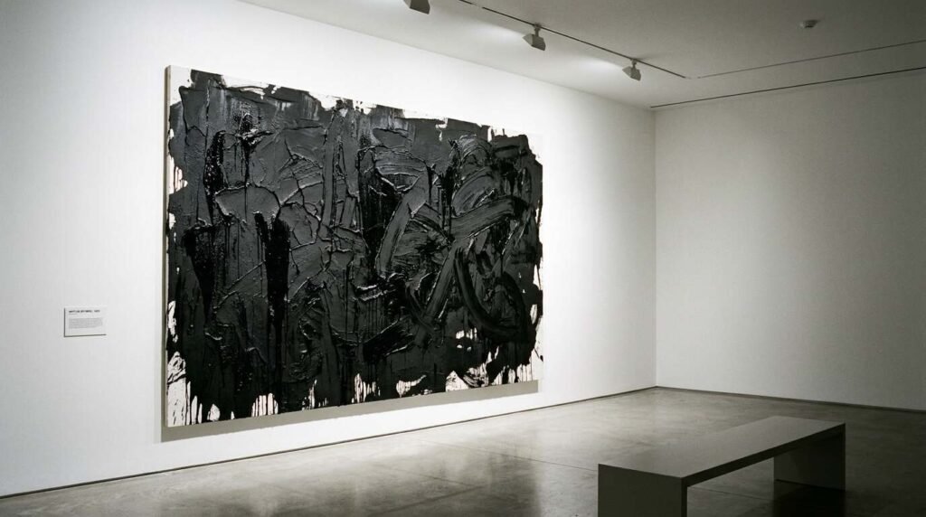 His tar paintings — large abstract works using roofing tar as a primary medium, referencing both minimalist abstraction and the labor of his father’s trade — hold this tension explicitly. They look, from a distance, like serious objects in the conversation of post-painterly abstraction. Up close, the material is literally what roofers use. The formal vocabulary is Western and contemporary; the material is working-class and Black and familial.