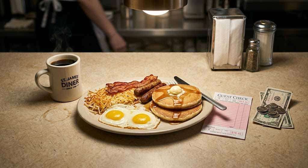 George’s Special is still on the menu: eggs, hash browns, bacon, sausage, two buttermilk pancakes. It easily feeds two people. It costs what it costs. It has been on the menu for decades because it is, in the language of the business, a vehicle. People who have never been to Tops before order it because it tells them what kind of place they’re in. People who have been fifty times order it because it’s what they order. The menu item is a contract.