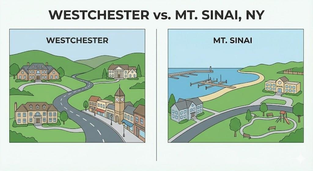 When New Yorkers start thinking about leaving the city for the suburbs, Westchester County is usually the first name on the list. Its proximity to Manhattan, elite school districts, and leafy neighborhoods have made it the gold standard of suburban living for over a century. But savvy buyers are increasingly discovering that Long Island’s North Shore — specifically Mount Sinai, NY — offers a comparable quality of life at a significantly lower price point. This in-depth comparison examines every angle of the Westchester vs. Mt. Sinai decision.